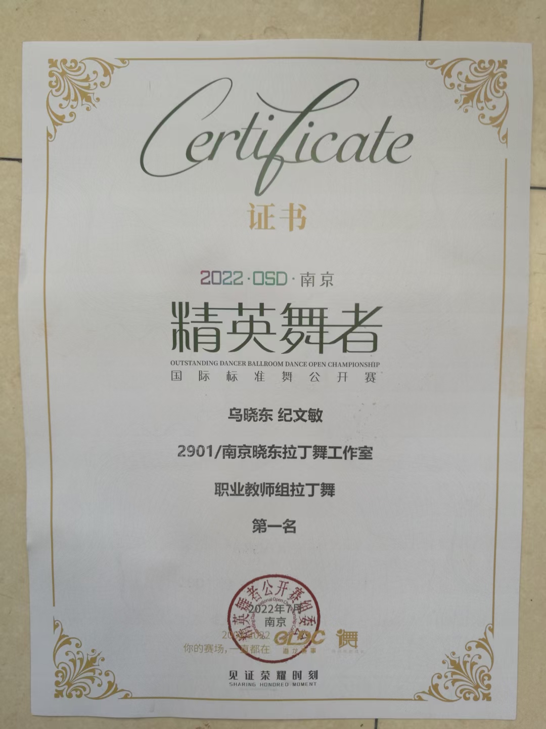 祝贺南京晓东拉丁舞工作室优秀学员教师纪文敏乌晓东获得2022年OSD精英舞者国际标准舞公开赛_南京站职业教师组拉丁舞冠军!